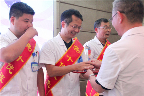 汪書記宣讀表彰通報(bào),韓兵、王書健、趙小康、徐先進(jìn)、張慧、徐松濤、祝愛民、朱春華、張明龍、阮宏智十位同志被授予醫(yī)院首屆“十優(yōu)醫(yī)生”稱號,在家出席會議的院領(lǐng)導(dǎo)分批為他們頒發(fā)了證書和獎杯。