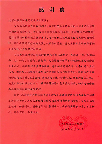 中石化安慶分公司2019年度大檢修順利收官,分公司領(lǐng)導(dǎo)到我院頒送感謝信,稱“石化醫(yī)院白衣天使是檢修現(xiàn)場一道靚麗的風(fēng)景線?!?/span>