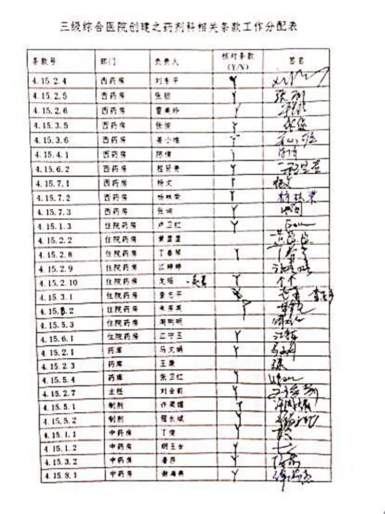 劉會(huì)前主任首先傳達(dá)了醫(yī)院創(chuàng)建的有關(guān)目標(biāo)和相關(guān)文件精神,振奮了人心,鼓舞了士氣。藥劑科創(chuàng)建條款,人手一條,從在創(chuàng)建條款工作分配表上簽上自己名字的那一刻開始,就要全程負(fù)責(zé)到底。