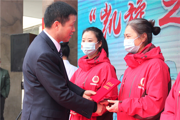 陳書記宣讀醫(yī)院嘉獎(jiǎng)令,周院長為隊(duì)員們頒發(fā)“白衣勇士”獎(jiǎng)杯。