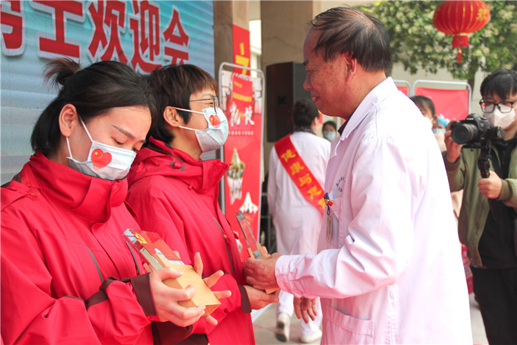 “你們頑強(qiáng)拼搏、奮勇向前,彰顯了石醫(yī)人的仁愛情懷、奉獻(xiàn)精神和良好形象。你們是我們的榜樣!”陳書記代表醫(yī)院致祝賀凱旋詞。