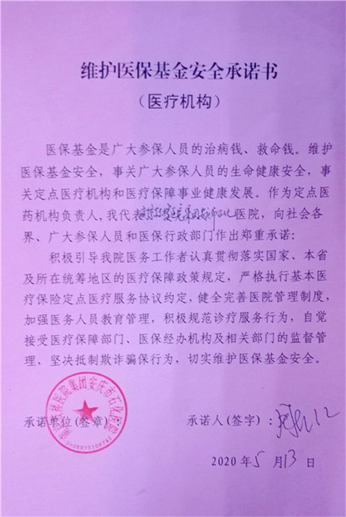 現(xiàn)場,周院長還代表醫(yī)院與醫(yī)療保障局基金監(jiān)管科副主任周美萍、科主任代表汪念東、護士長代表彭鳳艷簽訂《維護醫(yī)?;鸢踩兄Z書》,自覺接受醫(yī)療保障部門、醫(yī)保經(jīng)辦機構(gòu)等的監(jiān)督管理,堅決抵制欺詐騙保行為,切實維護醫(yī)?;鸢踩?。