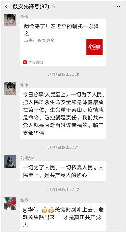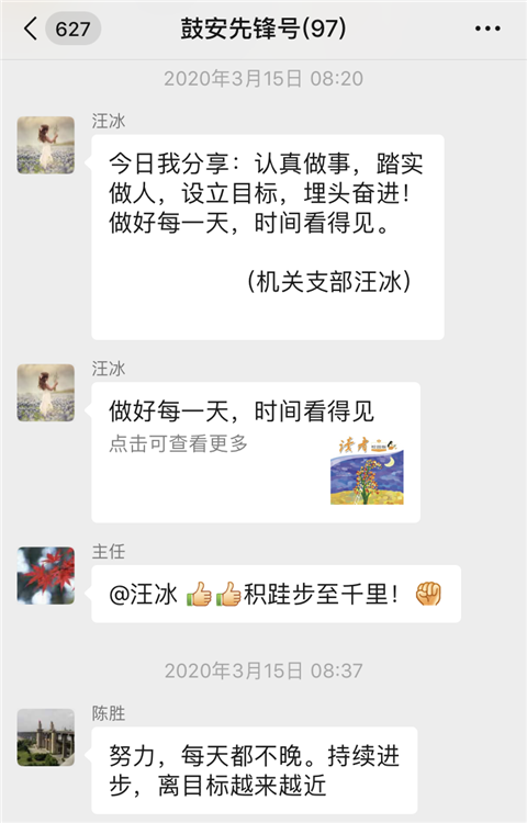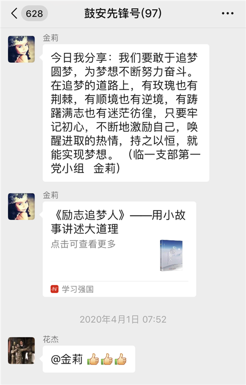為拓寬學(xué)習(xí)緯度、提高學(xué)習(xí)效果,今年3月以來,院黨委在全體黨員中開展了“今日我分享”活動(dòng)。臨床一黨支部、臨床二黨支部、門診黨支部和機(jī)關(guān)黨支部分別組織支部黨員,輪流在“鼓安先鋒號(hào)”黨員微信群分享自己近期的學(xué)習(xí)收獲。習(xí)近平總書記強(qiáng)調(diào)“好學(xué)才能上進(jìn)”,“今日我分享”現(xiàn)已成為了各黨支部、各黨小組、各黨員間互學(xué)互鑒的優(yōu)質(zhì)平臺(tái),大家交流思想,共促提升,塑造了自信自強(qiáng)、“腹有詩(shī)書氣自華”的高素質(zhì)石醫(yī)黨員新形象。