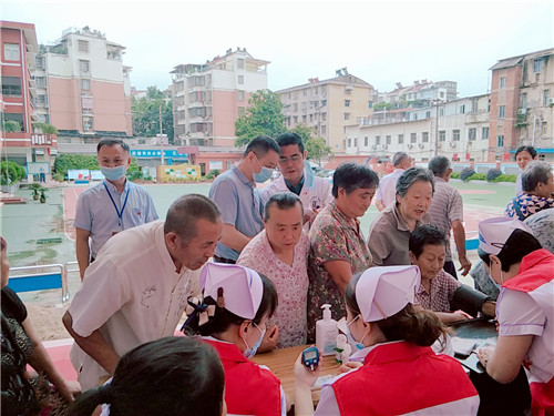 安置點現(xiàn)場,由相關(guān)科室專家組成的志愿服務(wù)隊的義診臺前排滿了前來測量血壓、血糖的受災(zāi)群眾。