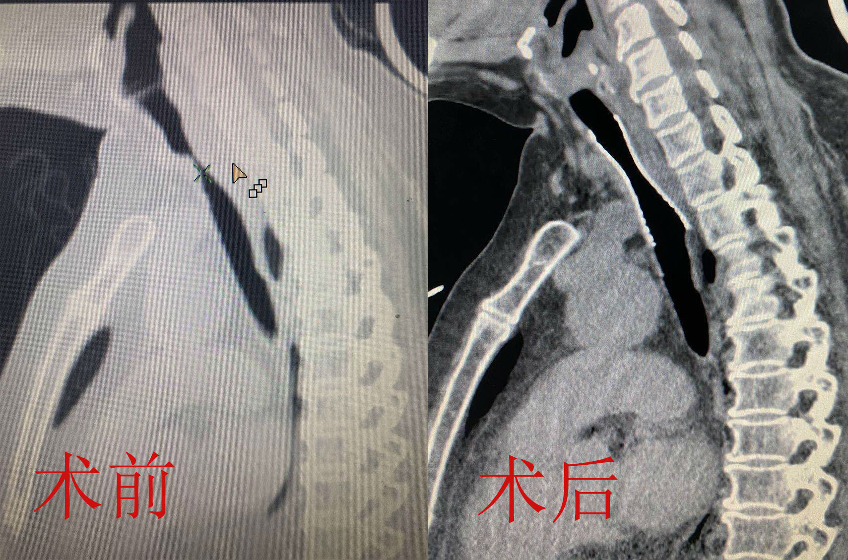 支架植入時,患者的氣管會被臨時堵塞,如何冷靜、準(zhǔn)確地在短時間內(nèi)快速釋放支架,為患者撐起一線生機(jī),術(shù)者的技術(shù)和經(jīng)驗至關(guān)重要。同時,該患者氣管狹窄位置較高,若支架植入過低,則不能發(fā)揮效果;若支架植入過高,術(shù)后咽部刺激感明顯,依然不能提高生活質(zhì)量。因此,精確定位支架也是此次手術(shù)的一大難點。