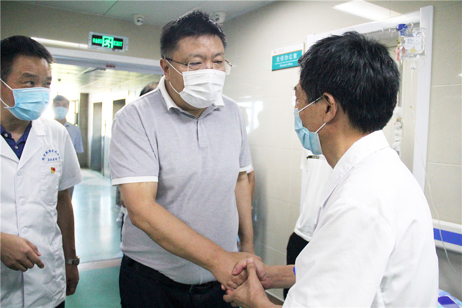 蔣興寶一行在金陵藥業(yè)黨委副書記、董事長、總裁梁玉堂的陪同下,深入病區(qū)看望一線醫(yī)護人員,將防暑降溫飲品送到他們手中。