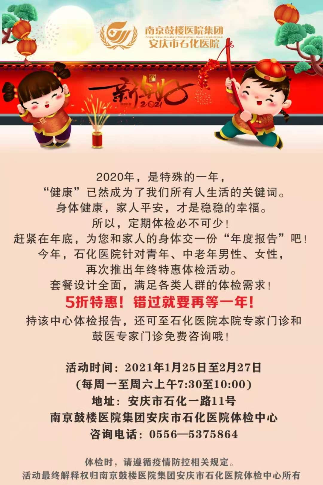 特殊的2020年已經(jīng)過去大家辛苦了一年也擔(dān)心了一年為了我們所有人的健康南京鼓樓醫(yī)院集團(tuán)安慶市石化醫(yī)院再次推出年終體檢套餐優(yōu)惠活動(dòng)請攜帶上你們的親人來參加