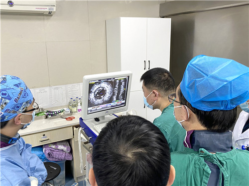 入院完善相關(guān)檢查后,由宋主任親自為方阿姨行微創(chuàng)球囊治療。憑借多年的經(jīng)驗和手感,導絲在宋主任的手里一點一點前行,終于穿過完全閉塞的右冠狀動脈。擴張球囊,行血管內(nèi)超聲發(fā)現(xiàn),此次發(fā)生支架內(nèi)再狹窄,是因為此前植入的支架選擇偏小,導致其不能牢固地粘著在血管壁上。找到了問題的癥結(jié),宋主任果斷選擇更大號的球囊進行充分擴張,配合切割球囊對血管壁上的動脈粥樣硬化斑塊進行切割處理,再于狹窄段選用藥物球囊進行治療。復查造影顯示,血流恢復暢通,再次行血管內(nèi)超聲檢查,支架貼壁良好。