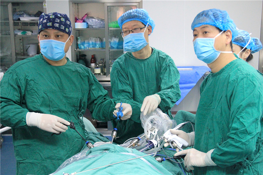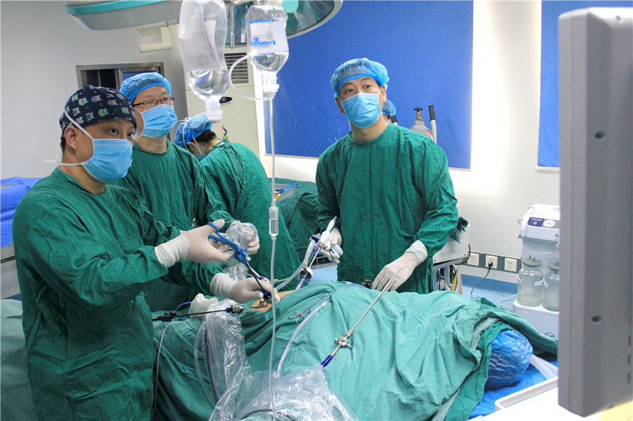 手術(shù)由操海寶副院長(zhǎng)主刀,在普通外科副主任醫(yī)師劉金兵、主治醫(yī)師潘曉益以及麻醉科副主任王超的配合下,剝絲抽繭,從容地避開腫瘤旁盤根錯(cuò)節(jié)的血管,憑借高超的腔鏡技術(shù),有條不紊地將深埋于李大爺體內(nèi)的腫瘤“炸彈”剝離。經(jīng)過(guò)三個(gè)小時(shí)的奮戰(zhàn),成功切下胰體尾及脾臟,整個(gè)切口不到6cm。