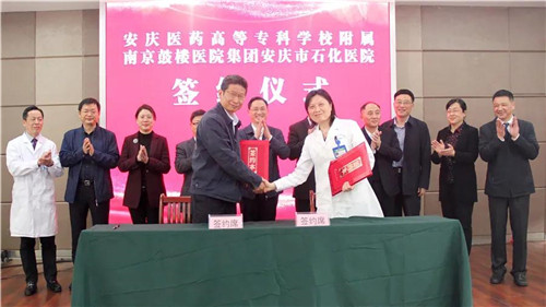 在各級領導的共同見證下,南京鼓樓醫(yī)院集團安慶市石化醫(yī)院院長韋寧華和安慶醫(yī)藥高等??茖W校校長姚文兵現(xiàn)場簽訂合作協(xié)議。