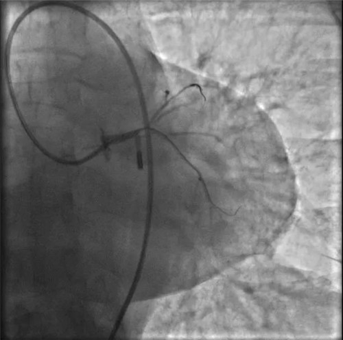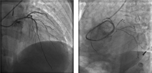 再行右冠造影,右冠近段也嚴(yán)重狹窄,未見(jiàn)右冠向左冠的側(cè)枝循環(huán)。
