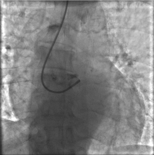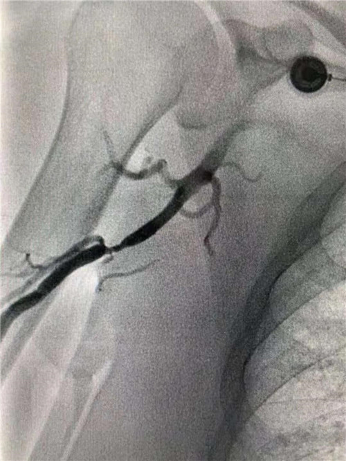 快速完成右側(cè)橈動(dòng)脈穿刺,上造影導(dǎo)管受阻后,行肱動(dòng)脈造影,發(fā)現(xiàn)右側(cè)肱動(dòng)脈重度狹窄。