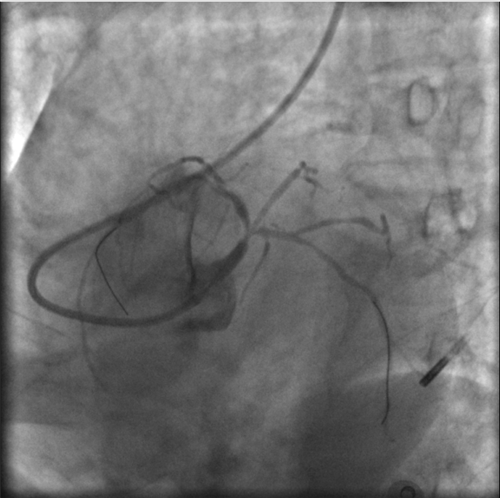 小心操作導(dǎo)絲及導(dǎo)管,艱難到達(dá)主動(dòng)脈根部,但導(dǎo)管難以“到位”左冠口,“冒煙”見(jiàn)左主干居然完全閉塞了。