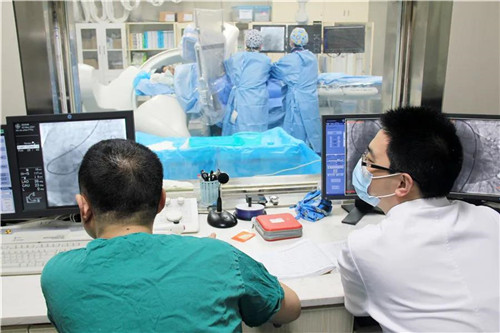 石化醫(yī)院暢通綠色急救通道,40分鐘后,救護(hù)車直接將胡女士送到了導(dǎo)管室,心血管內(nèi)科急診介入救治小組早已就位。