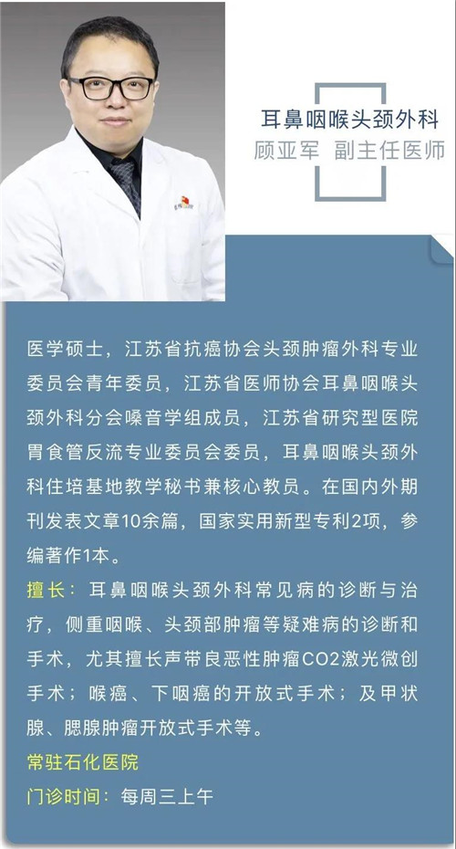 這個7月,在石化醫(yī)院耳鼻喉科坐診的南京鼓樓醫(yī)院專家是副主任醫(yī)師顧亞軍。