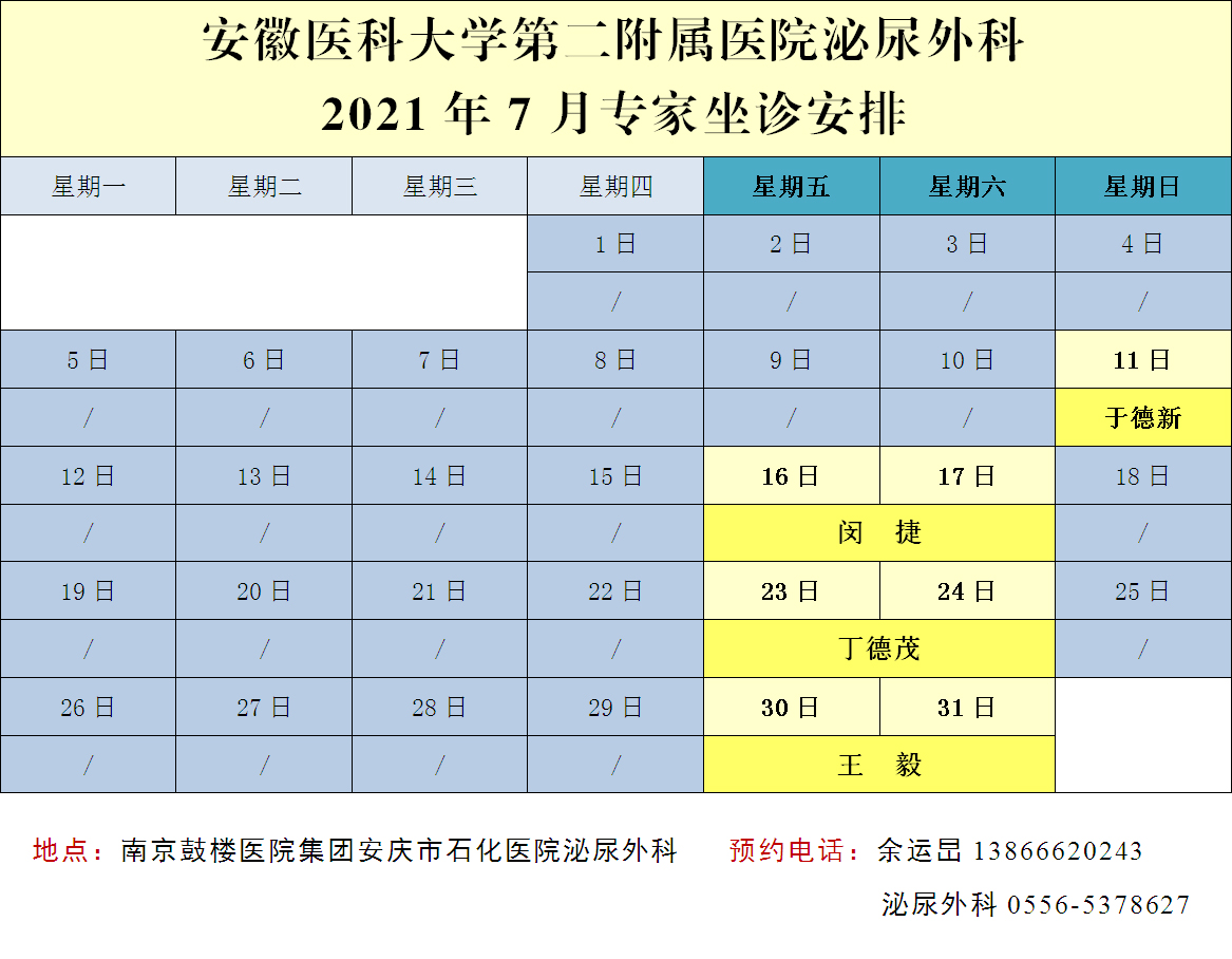接下來,安醫(yī)二附院泌尿外科副主任醫(yī)師閔捷、副主任醫(yī)師丁德茂、主任醫(yī)師王毅都將到石化醫(yī)院坐診,機會難得,不容錯過,趕緊撥打預約電話吧!