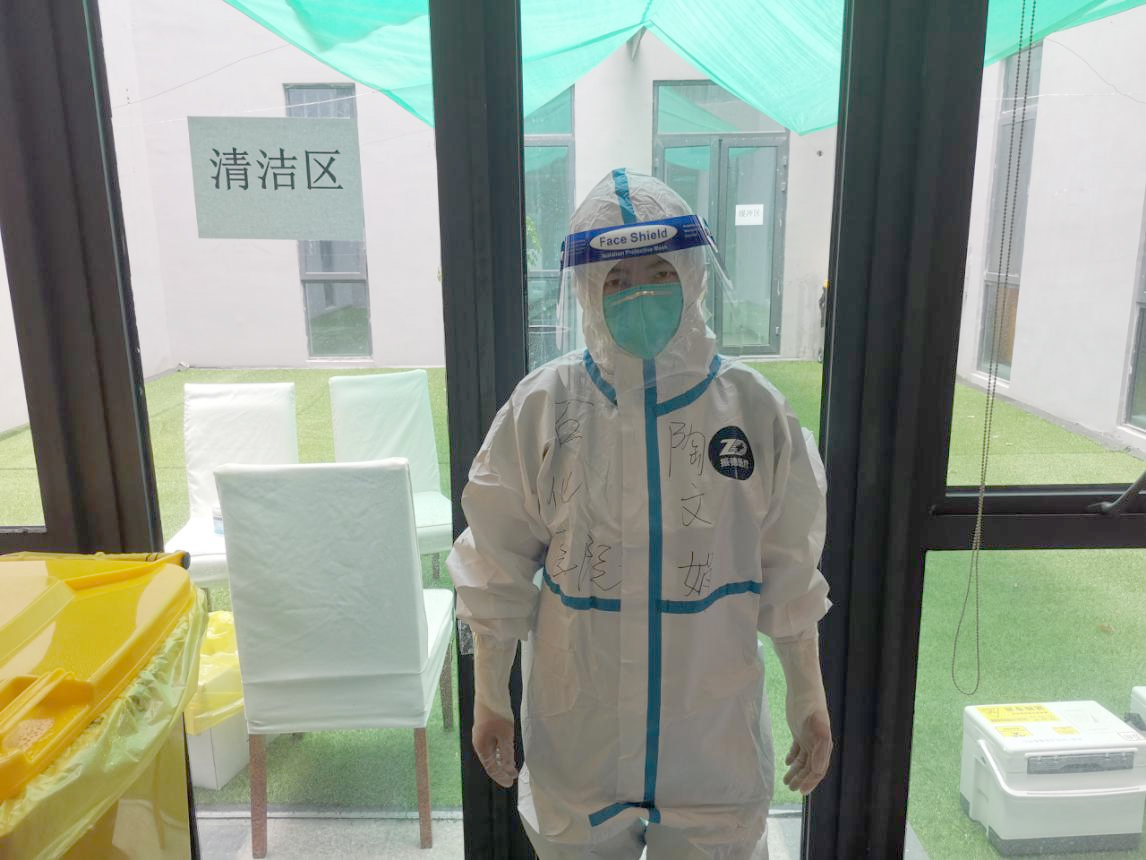 數(shù)十次往返于跨越五層樓的專用通道,我脫水嚴(yán)重,整個人累得快要虛脫。此時,兩個“大白”從遠(yuǎn)處緩緩向我靠近,是隊友汪麗潔和陶文娟來接應(yīng)我了。她們倆下午2點(diǎn)進(jìn)入隔離區(qū),一個發(fā)放中藥,一個做環(huán)境消殺,在得知我一個人正在接待新入住隔離人員時,顧不上吃晚飯,也等不及衣服干透,又再次穿上防護(hù)服來到隔離區(qū)幫忙。晚上7點(diǎn)半,15名隔離人員全部接待安排完畢。當(dāng)我們?nèi)朔祷貢r,只見一個人不停地朝緩沖區(qū)張望,“你們怎么才回來呀?對講機(jī)找你們也沒回,我生怕有什么事?!标犛押贿呎f著一邊遞上為我們準(zhǔn)備好的飲料。我們相視一笑,心里暖暖的,這個大家庭真好。