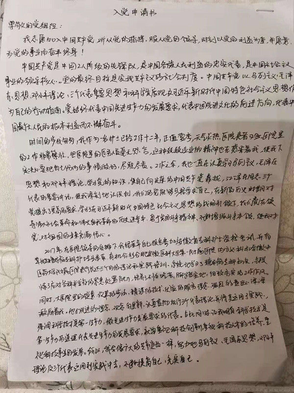 徐珍珍在入黨申請(qǐng)書(shū)中寫(xiě)道:“工作之余,我也一直認(rèn)真學(xué)習(xí)馬克思列寧主義、毛澤東思想、鄧小平理論、‘三個(gè)代表’重要思想、科學(xué)發(fā)展觀、習(xí)近平新時(shí)代中國(guó)特色社會(huì)主義思想,學(xué)習(xí)黨的知識(shí),積極向黨組織靠攏......勇于發(fā)揚(yáng)斗爭(zhēng)精神,不斷增強(qiáng)自身本領(lǐng),努力成為一名共產(chǎn)黨員?!弊鳛樯碓趹?zhàn)疫一線的醫(yī)護(hù),徐珍珍深刻地體會(huì)到了黨的力量,更加深切地感受到了黨員的榜樣作用,在增強(qiáng)戰(zhàn)勝疫情信心的同時(shí),也堅(jiān)定了入黨的信念。