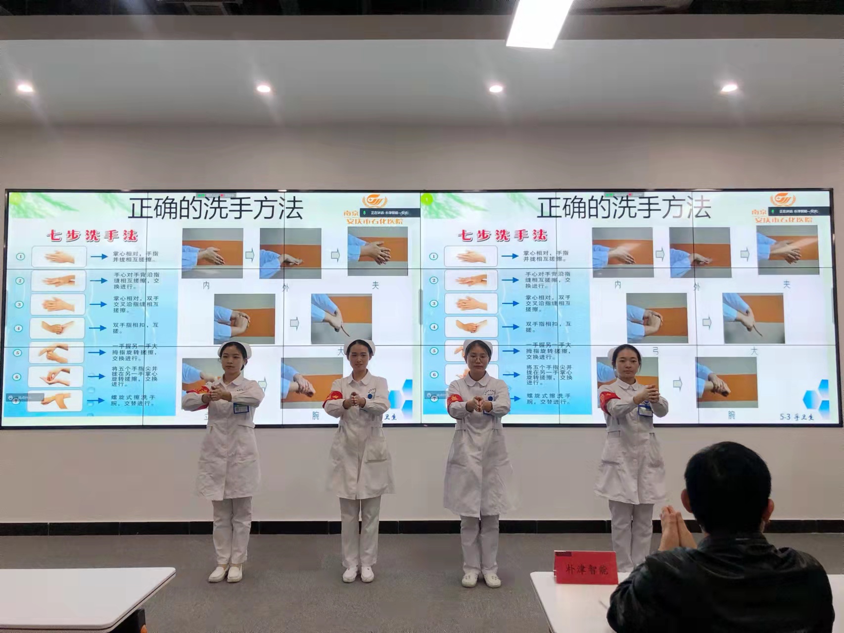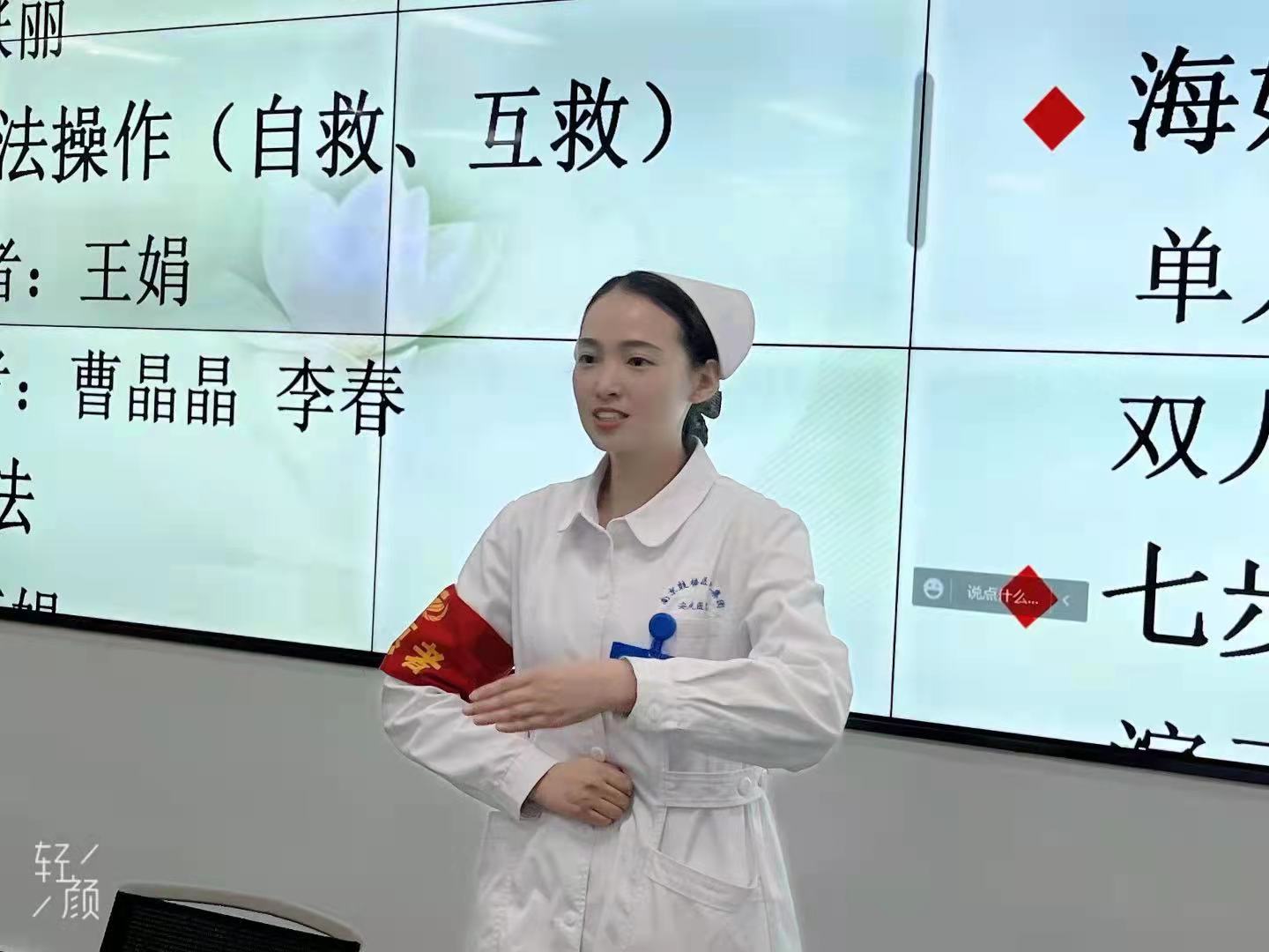 護士王娟進行單人海姆立克法自救演示;護士曹晶晶及李春進行雙人海姆立克法互救演示。