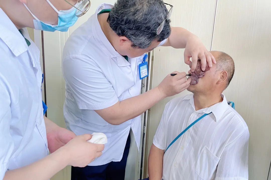 在專家門診診室內(nèi),譚謙教授和石化醫(yī)院燒傷整形一病區(qū)主任李江虹正在認(rèn)真查看張先生的面部情況。原來(lái),張先生左側(cè)面部的贅生物自嬰幼兒時(shí)期就持續(xù)增長(zhǎng),40余年時(shí)間長(zhǎng)至約5cm×5cm大小,未進(jìn)行規(guī)律診治。近10年,增生速度明顯加快,體積變大,垂于面部,嚴(yán)重影響日常生活,張先生希望可以通過(guò)手術(shù)改善。