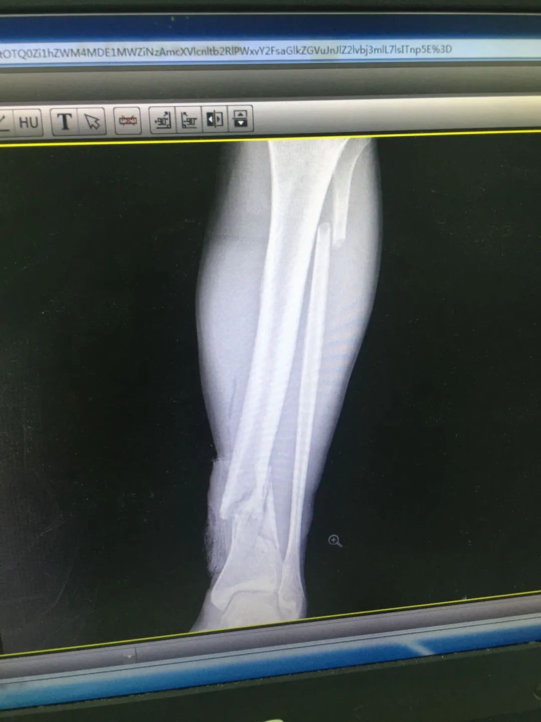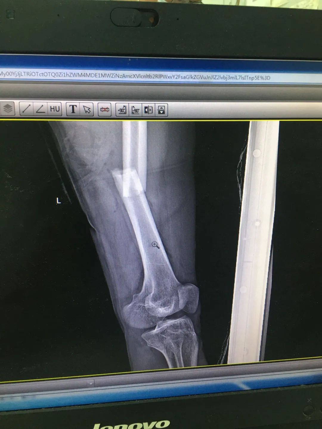 骨科徐自勝醫(yī)生為劉先生仔細(xì)查體后發(fā)現(xiàn),其頭頂部偏左位置有一長(zhǎng)約3cm的傷口,深達(dá)顱骨,周?chē)醒E;左股骨中段位置畸形、腫脹,肉眼可見(jiàn)一道長(zhǎng)約5cm的傷口,有血液流出,局部壓痛陽(yáng)性;左小腿遠(yuǎn)端腫脹、畸形,也有一道2cm的傷口,左下肢活動(dòng)嚴(yán)重受限。