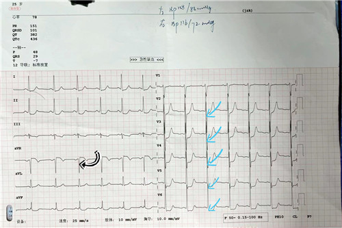 心電圖示aVR ST段抬高,胸導(dǎo)ST段壓低,提示心肌缺血
