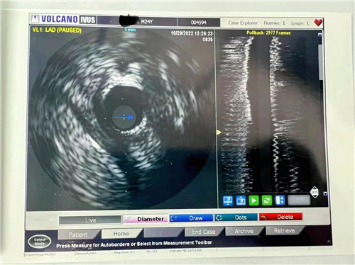 心血管內(nèi)科潘林艷醫(yī)生對(duì)其進(jìn)行正規(guī)冠心病二級(jí)預(yù)防治療后,患者癥狀稍有緩解。副院長、科室主任汪念東及副主任徐先進(jìn)再對(duì)其行冠脈造影(CAG)+血管內(nèi)超聲(IVUS)檢查,提示斑塊負(fù)荷重,確診為“急性冠脈綜合征”。