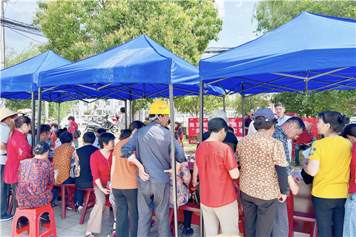 塔畈鄉(xiāng)政府門前排隊等候的村民翹首以盼,由石化醫(yī)院9個科室14名醫(yī)護人員組成的專家隊伍驅車2小時到達后,立即投入義診。