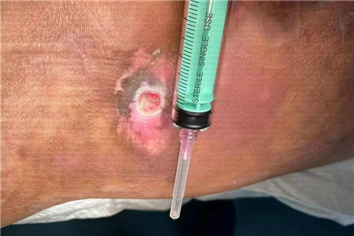 經(jīng)科室醫(yī)護(hù)耐心換藥,患者陰囊處竇道逐漸恢復(fù),但長期癱瘓在床,致使骶尾部的壓瘡愈合變得格外困難。針對患者病情,科室團(tuán)隊充分討論,最終,葉主任決定施行富血小板血漿治療術(shù)+骶尾部1%擴(kuò)創(chuàng)。