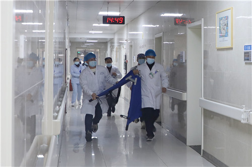 隨后,評估工作組組織醫(yī)護(hù)開展消防演練,模擬患者家屬在急診科病房吸煙,引燃易燃物致火勢蔓延。值班護(hù)士巡查時(shí)發(fā)現(xiàn)火情,第一時(shí)間按響手報(bào)向消控室報(bào)警,就近持滅火器材滅火;另一名護(hù)士聽到報(bào)警聲后第一時(shí)間通知病區(qū)并撥打安全保衛(wèi)科和119火警電話;科主任陳丙紅和護(hù)士長石嘉麗立即啟動火災(zāi)處置和人員疏散應(yīng)急預(yù)案,轉(zhuǎn)運(yùn)病人至安全病區(qū),組織人員撤離;消防滅火組在接到火災(zāi)報(bào)告2分鐘內(nèi)快速穿著消防服趕到現(xiàn)場進(jìn)行滅火。