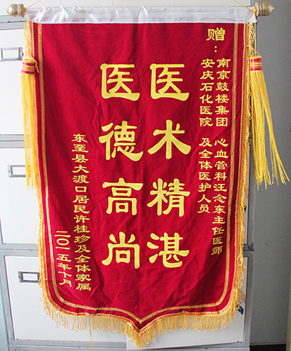 近日,我院收到患者贈送的多面錦旗。普通外科尹衛(wèi)民副院長、吳爾水主任、操海寶、芮悅醫(yī)生及全體醫(yī)護(hù)、心血管內(nèi)科汪念東主任及全體醫(yī)護(hù)均獲得患者贊揚(yáng)。