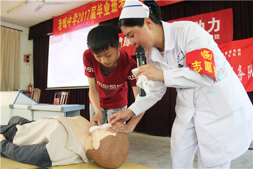 活動(dòng)中,護(hù)理干事陳麗娟擔(dān)任解說員,將急救的基本知識(shí)及相關(guān)措施做了詳細(xì)解說。志愿者劉風(fēng)英護(hù)士長(zhǎng)則根據(jù)授課內(nèi)容為孩子們示范操作,言傳身教,加深了孩子們對(duì)急救知識(shí)的理解和實(shí)際應(yīng)用。與此同時(shí),針對(duì)高年級(jí)學(xué)生中考焦慮問題,花杰副院長(zhǎng)結(jié)合實(shí)際生活案例和臨床經(jīng)驗(yàn),將考前焦慮的應(yīng)對(duì)和預(yù)防向同學(xué)們娓娓道來,現(xiàn)場(chǎng)學(xué)習(xí)氛圍濃厚,起到良好的培訓(xùn)效果。