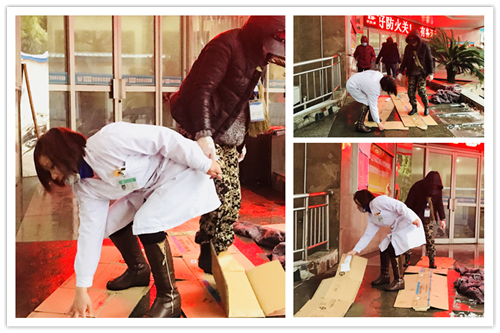 1月25日清晨地面濕滑,部分路面上凍,有很多醫(yī)護(hù)人員都選擇了走路上班。為保障患者和員工的健康安全,預(yù)防暴雪來(lái)臨,我院高度重視,積極應(yīng)對(duì),保安、保潔人員不厭其煩、一遍遍清掃主干道路積雪、冰碴,嚴(yán)防進(jìn)一步結(jié)冰;行政綜合科工作人員在濕滑的臺(tái)階、路面鋪墊紙板、布?jí)K,做好一切防滑措施。