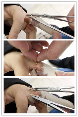 一般遇到此類情況,會先讓患者聯(lián)系消防部門取下戒指后再進(jìn)行傷口處理。但此時,窗外飄起了大雪,患者疼痛難忍,為不耽誤治療,急診科王志遠(yuǎn)醫(yī)生急中生智,利用血管鉗和持針器夾住戒指,以巧勁將戒指拎斷,再用手慢慢擴(kuò)大戒指圈,最后用血管鉗和持針器將戒指取下。隨后立即為患者進(jìn)行清創(chuàng)縫合,快速處理好傷口,贏得了寶貴的治療時間。
