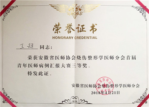 4月21日,在安徽省醫(yī)師協(xié)會(huì)燒傷整形學(xué)醫(yī)師分會(huì)首屆青年醫(yī)師病例匯報(bào)大賽上,我院燒傷整形二病區(qū)楊賢金主任率領(lǐng)年輕醫(yī)生鄭艷、王超參賽。