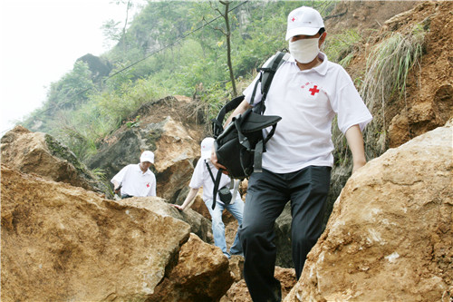 翻看當(dāng)年醫(yī)療隊留下的資料,其中一張照片非常感人。坍塌山體的碎石間,一個醫(yī)生背著大大的醫(yī)療包,盡力彎著身子,左手牢牢抓著一位老鄉(xiāng)手臂,兩人一個低著頭,一個背著身,都看不見臉上的表情,但是伸手間傳遞的濃濃魚水之情一下子就觸動了觀者,從身形,判斷出這是普外科主任吳爾水。