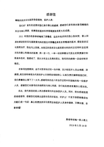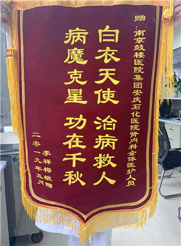 祥梅阿姨是我們的老病號(hào),也是我們的老朋友,長(zhǎng)期在我們科住院行透析治療?!拔襾砜纯茨銈?,給你們送錦旗和表揚(yáng)信來啦!謝謝你們一直以來對(duì)我的照顧!”