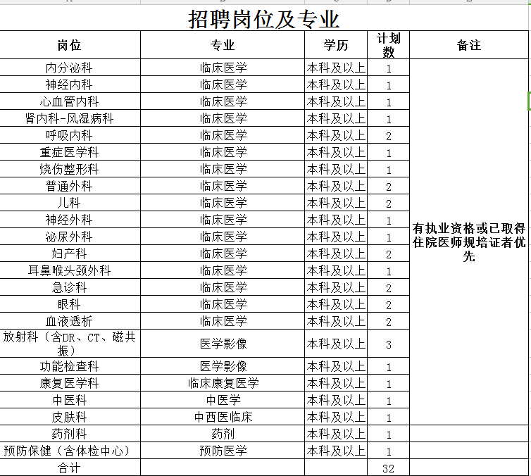 因工作需要,經(jīng)研究,我院決定公開招聘 32名衛(wèi)生專業(yè)技術(shù)人員。現(xiàn)將有關(guān)事項通知如下: